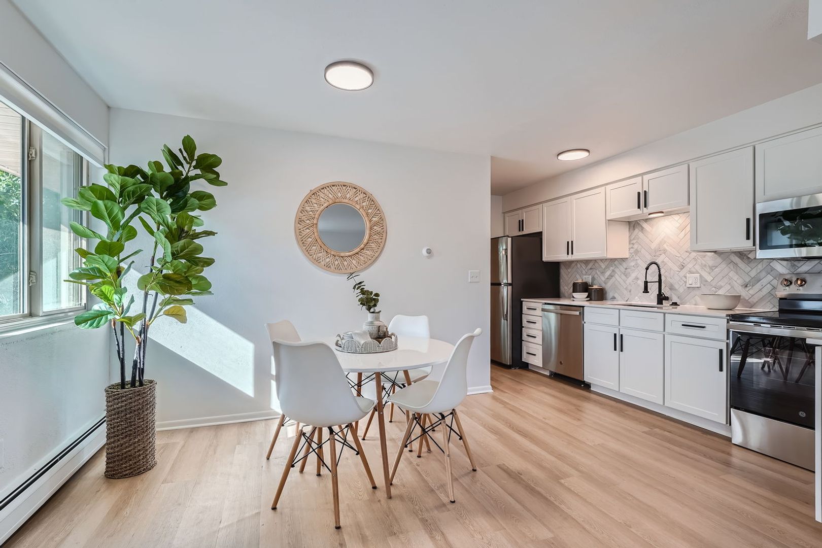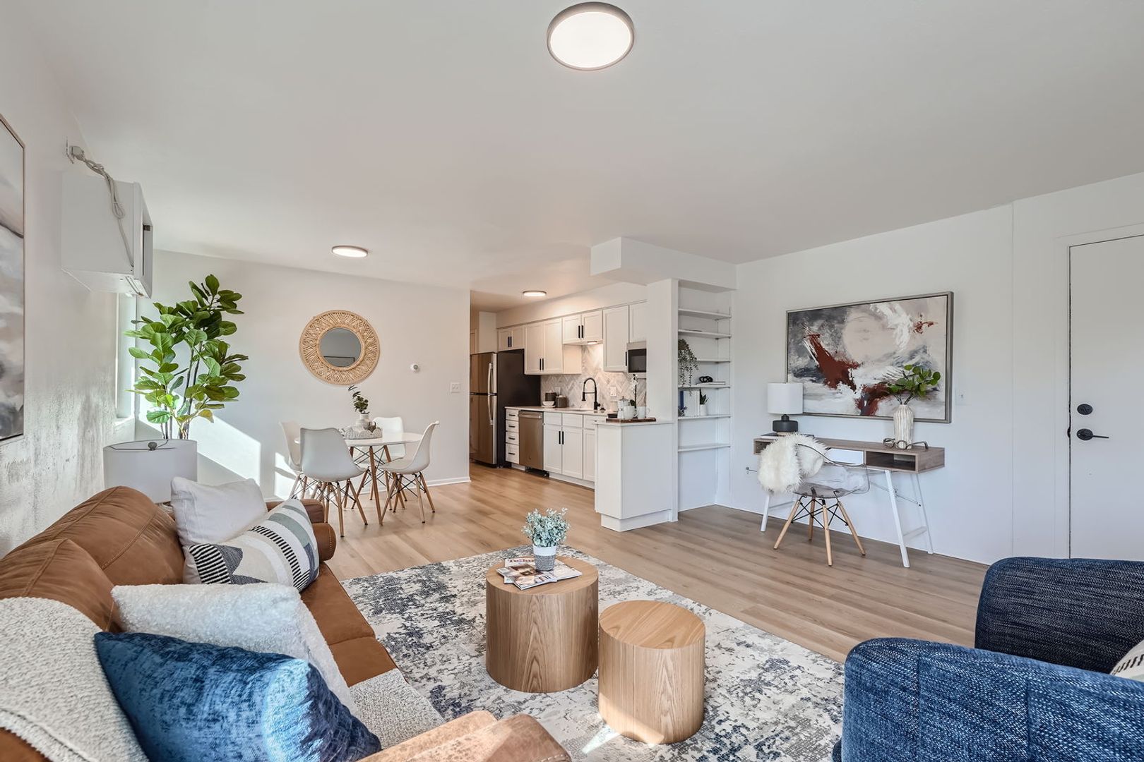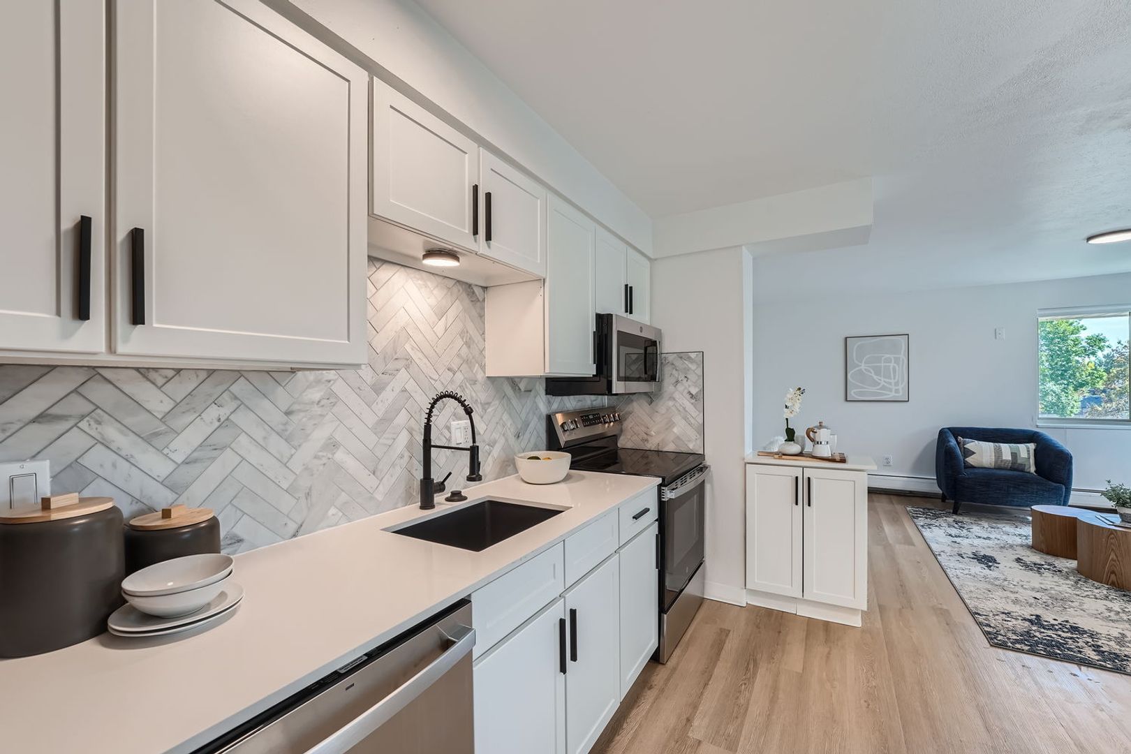 Portals Apartments feature thoughtfully redesigned 1-bedroom apartment homes with well-appointed interiors. Our renovated apartment homes (coming soon!) include quartz countertops, stainless steel appliances, elegant luxury vinyl plank flooring, new shaker-style cabinetry and modern lighting and hardware fixtures.